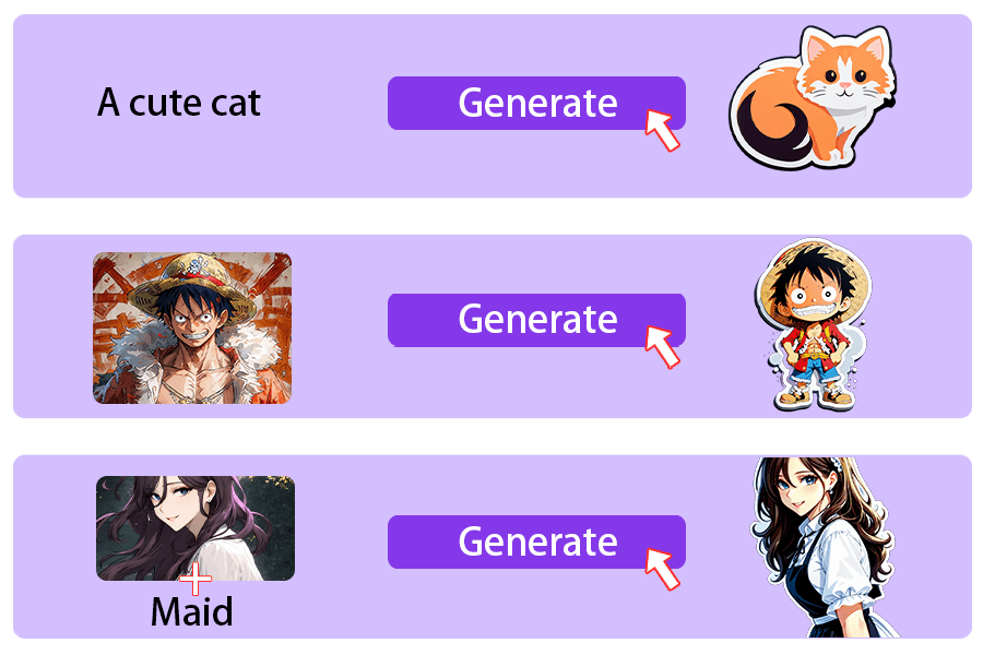 Enter the prompt text or upload an image and let AI customize your desired sticker at your fingertips.