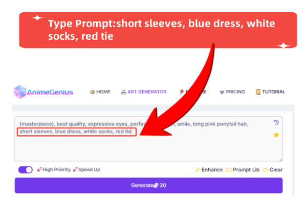 Enter the keywords for your custom anime outfit in the prompt input box, such as "short sleeves, blue dress, white socks, red tie."