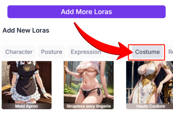 Select any model, then choose "Add More Loras". In the Costume section, find the outfit you like and click to add it.