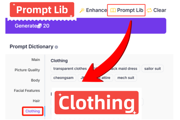 Access the “Prompt Lib” in the generation area, switch to the Clothing section, and select the clothing keywords you like to add.