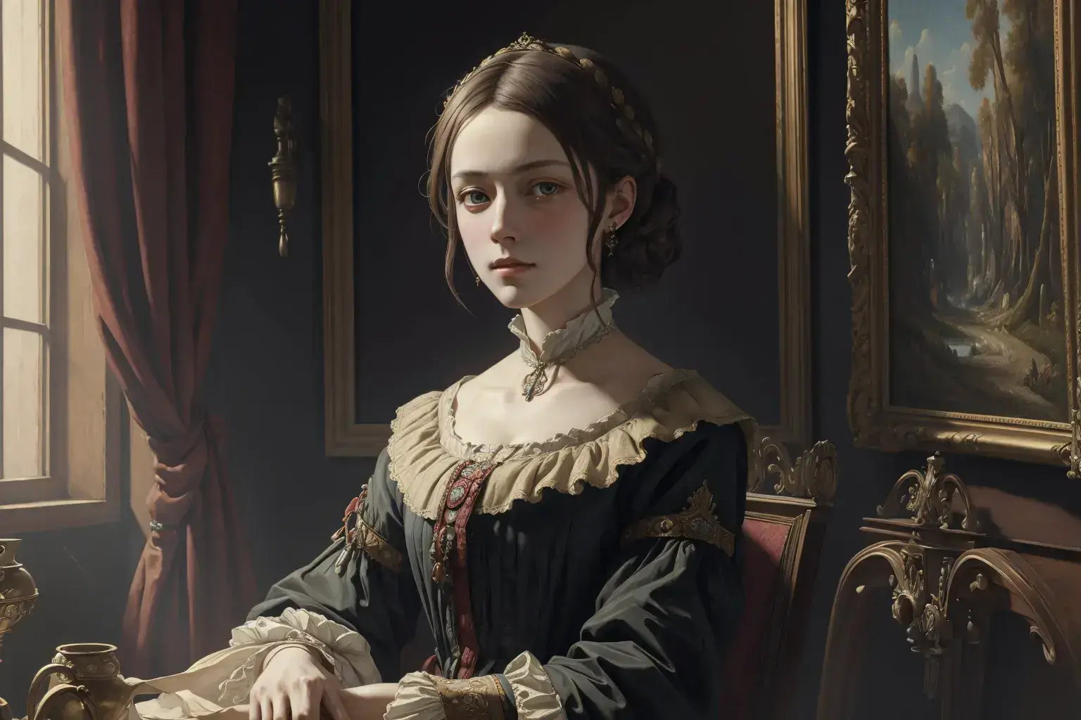 Prompt: masterpiece, best quality, official art, extremely detailed CG unity 8k wallpaper, highly detailed, absurdres, female, ((19th century oil painting style))