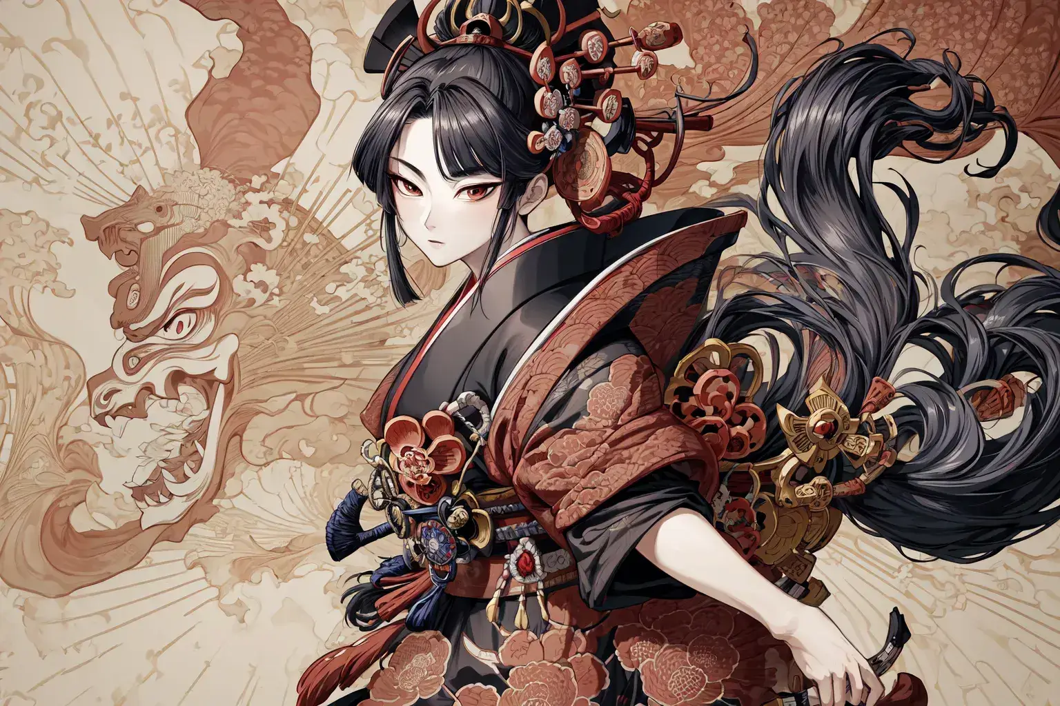 Prompt: masterpiece, best quality, official art, extremely detailed CG unity 8k wallpaper, highly detailed, absurdres, samurai, illustration,(((19th century Japanese ukiyo-e style))), female