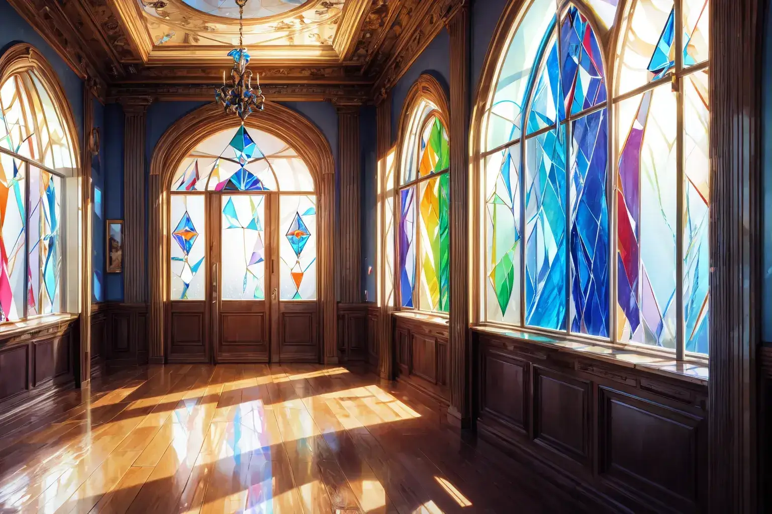 Prompt: masterpiece, best quality, official art, extremely detailed CG unity 8k wallpaper, highly detailed, absurdres, rainbow, indoor, (((Dalle de verre)))