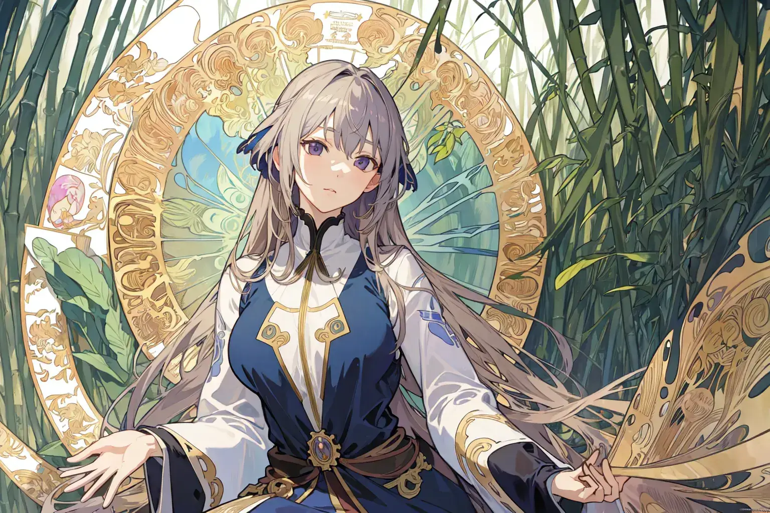 Prompt: masterpiece, best quality, official art, extremely detailed CG unity 8k wallpaper, highly detailed, absurdres, Panorama,((alphonse mucha)), yukiwo, bamboo forest