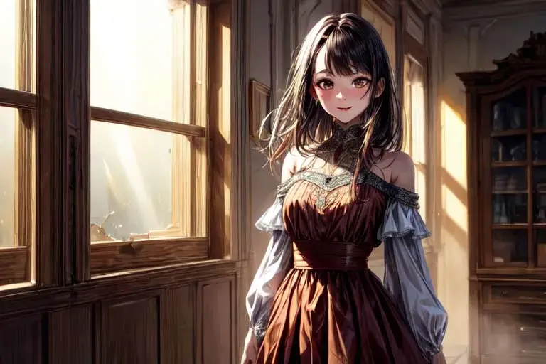 Spell Prompt: Best quality, masterpiece, ultra high res, (Authentic skin texture:1.3),panorama, character portrait, very wide shot, half body, narrow waist, cowboy shot, indoor, a beam of light, dust, Tyndall effect, happy(expression), against window, 1girl, beautiful detailed eyes and face, off shoulder, head down, brown eyes